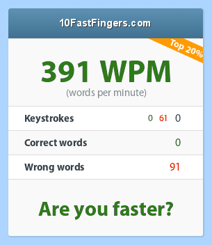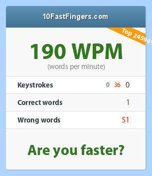 Ovo u mene jest real, samo sto sam opteretio komp do maximuma i usporilo sve pa cak i browser pa mi je onih 60 sekundi trajalo 3-4 minute, a ispisao sam sve rijeci, dosao do kraja i ostalo mi jos 5 sekundi da cekam, nestalo rijeci, samo sto vi sa dual core, core2duo x2 procesorima ne mozete opteretiti komp koliko sam ga ja opteretio sa 3.06 single core, tu je tajna mog uspjeha, a kada je neopterecen mogu oko 50-60 rijeci i to da profulam 1-2 zbog č ć š đ ž, jer ih nisam navikao pisati :S