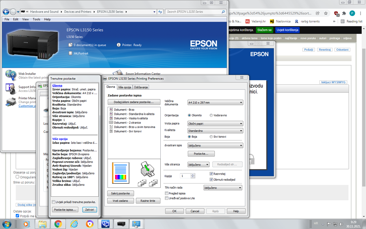 Meni stigao danas epson l3151 platio novi preko njuskala 900kn sa printerom sve uredu danas isprobao međutim zanima me na koji nacin postic da printer ostane upaljen cijelo vrjeme jer kada ga ostavim upaljenog on se ugasi kroz 10min.. Isto tako sto se tice skeniranja skenira mi jedan dokumenat u 4 djela al to se valda treba posebno nastimat sve u svemu dobar printer samo kod kopiranja u boji vidi se razlika izmedu orginala i neorginala boje su npr kod uplatnica dosta bljede, tu mi je canon g3400 radio puno bolje..